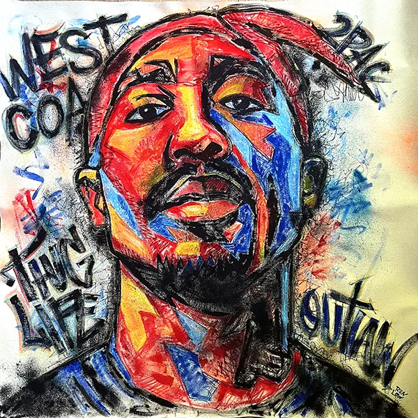 Je travaille principalement sur des toiles carrées de 75 à 80 cm, en utilisant la bombe, la gouache, l’acrylique et les Posca pour créer des compositions dynamiques, colorées et vibrantes.